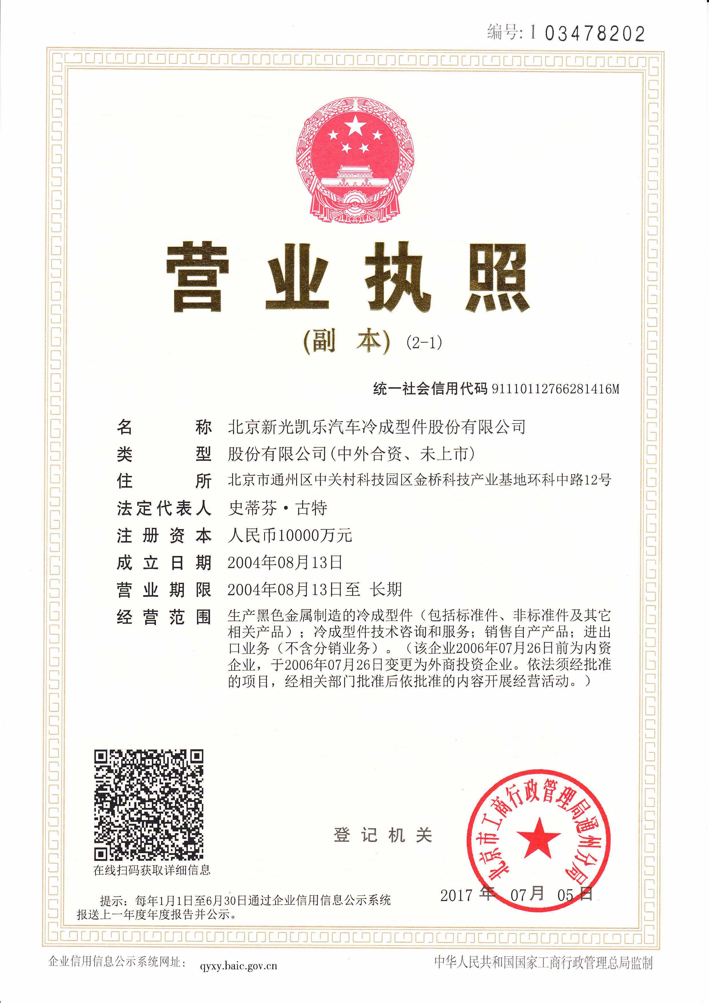 北京新光凱樂(Singu Keller)汽車?yán)涑尚图煞萦邢薰?br> 是由邢臺(tái)鋼鐵有限責(zé)任公司和德國 A&E KELLER公司合資組建, 開發(fā)生產(chǎn)汽車?yán)涑尚图捌渌芎谏饘僦瞥善贰?